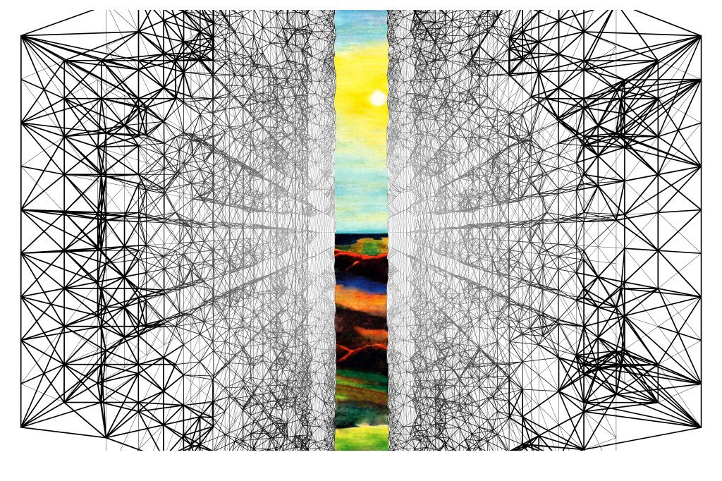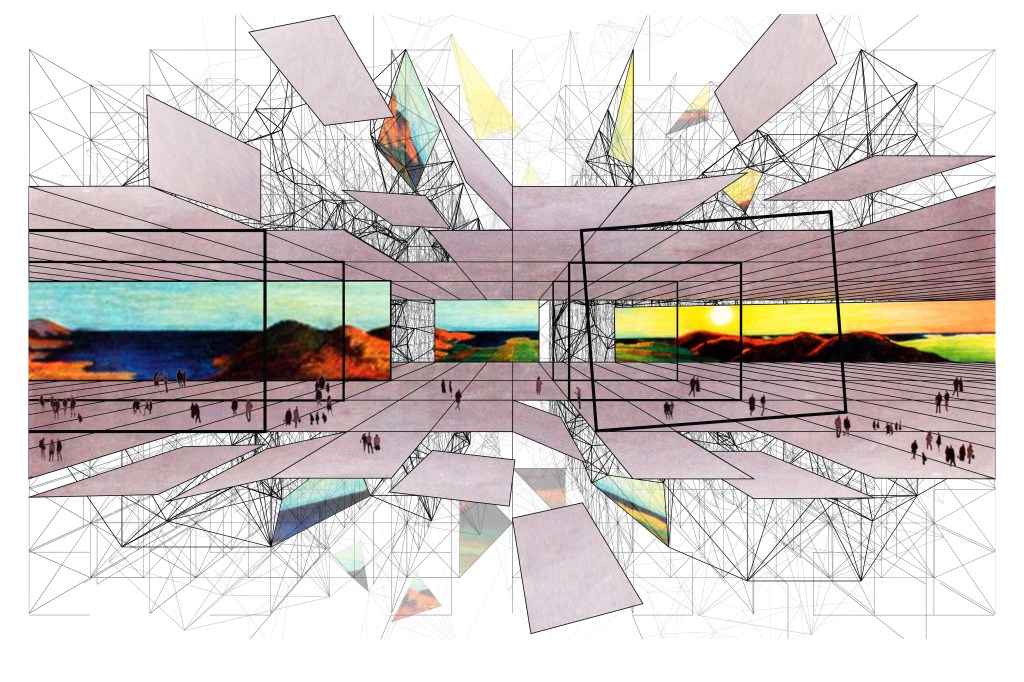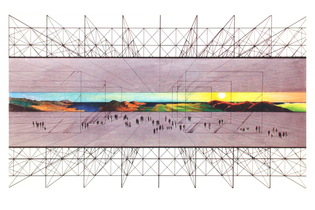 The derivations of Archizoom’s work that I present here, attempt to redefine the perceived horizon with a more technologically driven interpretation and express the inevitability of this new technological horizon. The exact character of this horizon is intentionally vague due to the projective nature of the exercise, but the new drawings intentionally reference the nodal system to express the importance that such a revolutionary shift in information management will have on our perceived reality in the years to come.